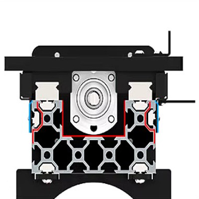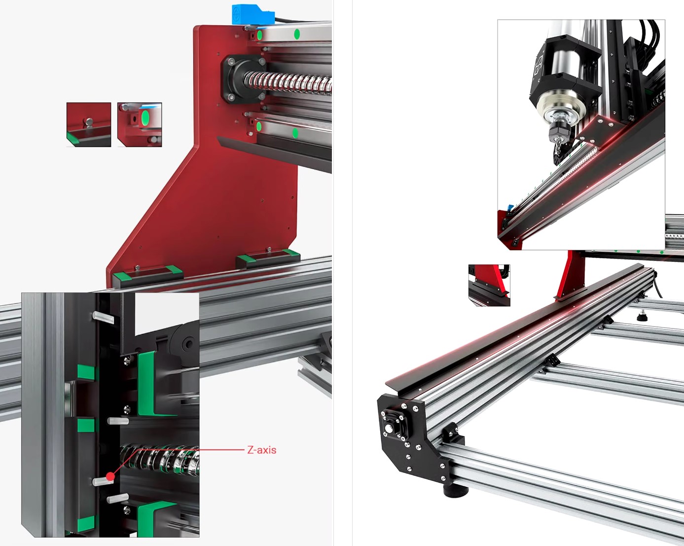 Wszystkie osie CNC1515 mają śruby kulowe całkowicie wgłębione w aluminiowe rowki, co eliminuje potrzebę stosowania podkładek ślizgowych, co skutkuje lepszym dopasowaniem.