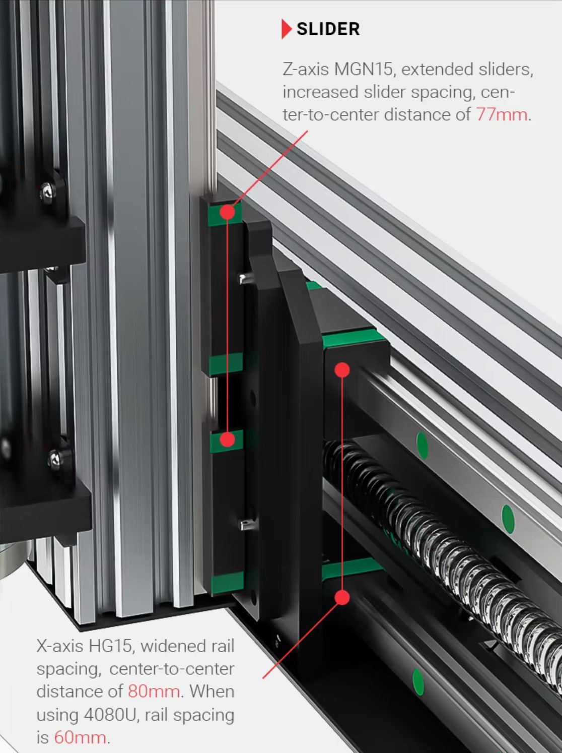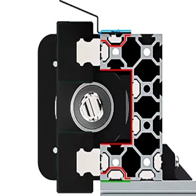 Wsporniki kątowe łączące oś X dodatkowo wzmacniają szczeliny montażowe na szynie.