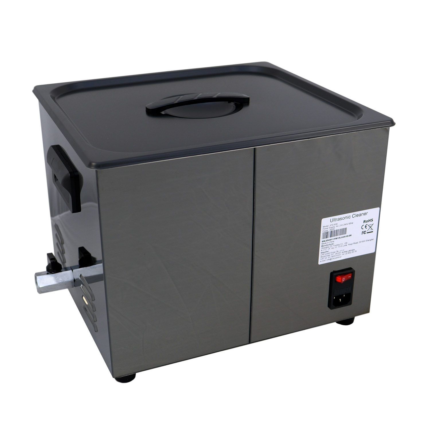 Myjka ultradźwiękowa GX60A jest wyposażona w zbiornik z wysokiej jakości stali nierdzewnej SUS304 o pojemności 15L, moc ultradźwięków: 360W i grzałkę: 400W.
